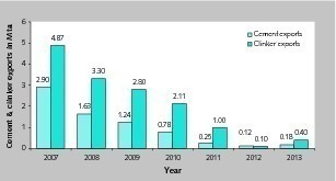 Exports of cement and clinker have fallen dramatically over the last few years (Fig. 4). While cement and clinker exports still amounted to 2.90 and 4.87 Mta respectively in 2007, by 2013 they were only 0.18 and 0.40 Mta respectively, showing a slight recovery from even lower 2012 export volumes. But in the 1st Q of 2014 cement exports again declined by 19.6 % YoY to just 0.069 Mta. The main reasons for the decline in exports over the last few years were increasing domestic demand and very high capacity utilization rates of all Indonesian market participants. Other factors were lower price exports from Vietnam and Pakistan, which made Indonesian exports less attractive.