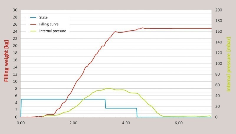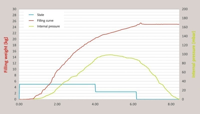 As a standard rule it is given that a higher permeability of the empty sack will achieve a better filling performance. Different sack constructions like the 5+5 Gurley seconds made from QuickFill® paper in comparison with the 15+15 Gurley seconds will result in a 20 % quicker filling time and 50 % lower internal pressure inside sack as in this example (Figs. 10 and 11).