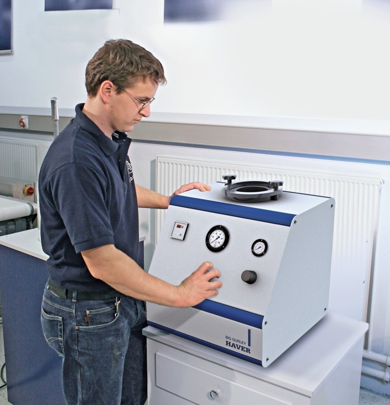 With the Haver Big Gurley® (Fig. 4), the air permeability of packaging material can be measured and assessed. The test equipment provides information about the porosity and air permeability of the sack wall, not only with clean/unused paper, but also with contaminated paper. It shows the influence of the product on the paper during filling (Fig. 5). The fine product particles can decrease the permeability by blocking the holes between the fibers. It is dependent on many factors such as particle size, moisture content, temperature, and so on. With this instrument it is possible to test the complete sack wall construction.