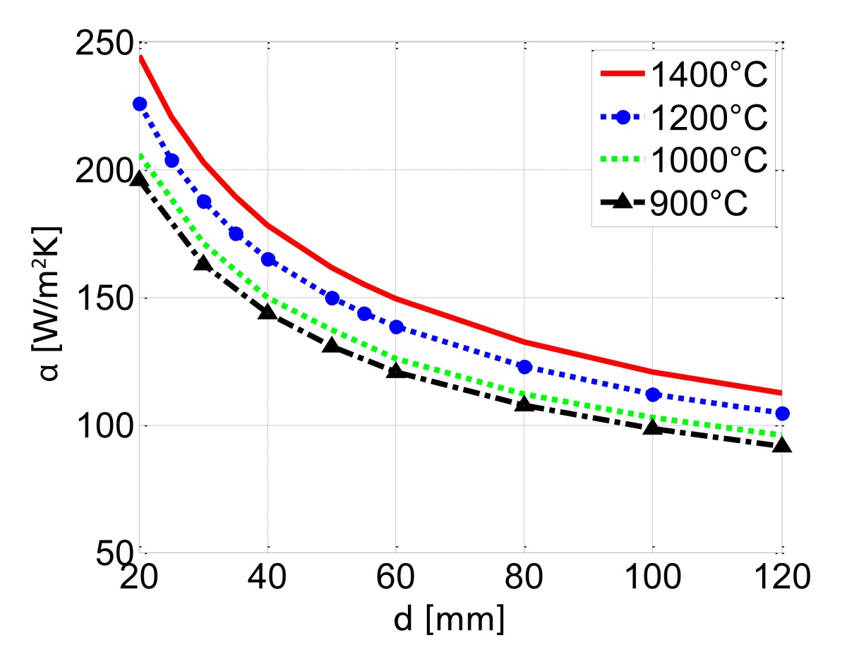 Figure 3 presents the convective heat transfer coefficient in respect of particle size for different kiln gas temperatures. It strongly decreases with size of the particles with the power of approximately 0.5. The gas temperature only has a slight influence.