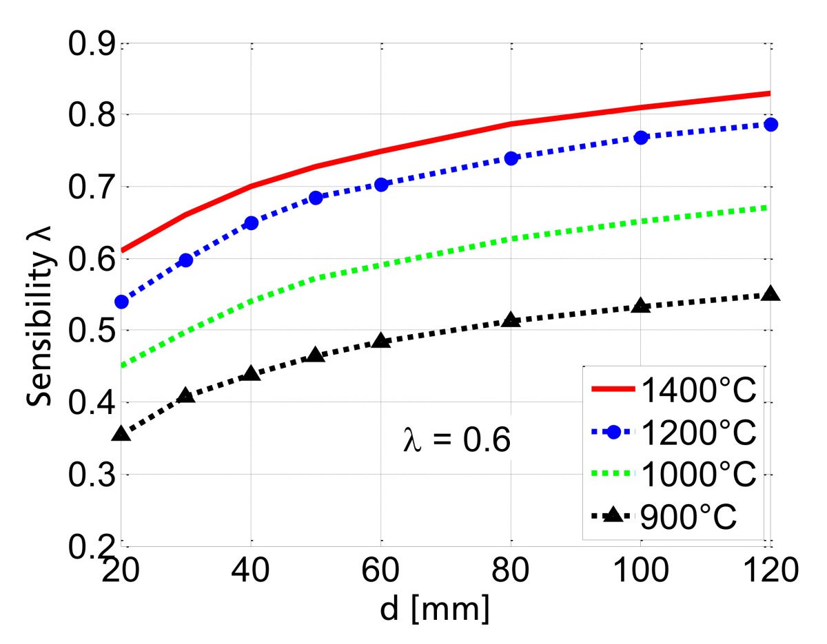Figure 8 describes the sensitivity of the diffusion. Its values increase with the diameter similar to the thermal conductivity. At temperatures above 1000 °C, the influence is very small. For large particles and temperatures around 1000 °C, such as in PFR kilns, the influence can reach 15 %.