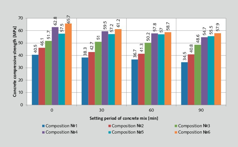 Application of superplasticizers “Relamix T-2” (composition No. 3) or “Remicrete SP60” (composition No. 5) makes it possible to save the potential compressive strengths of the samples of the concrete mixes with a setting period of 90 min. For example, the compressive strength of the samples cast from the concrete mix with composition No. 3 is reduced by 10% at 1 day and by 6 % at 28 d when the concrete mix has a setting period of 90 min.
