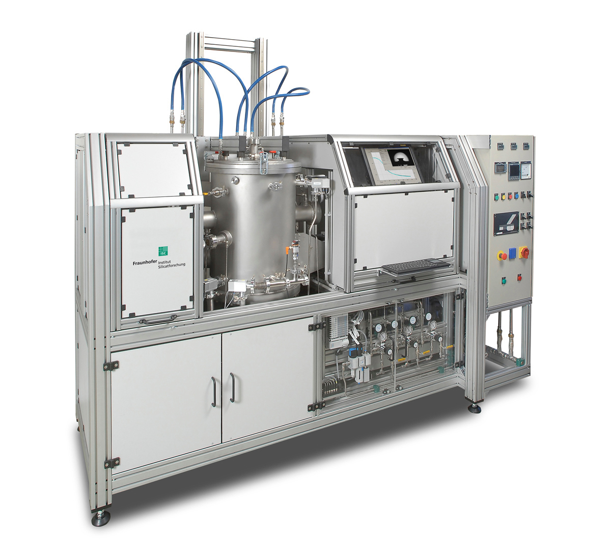 Weight changes taking place in the sample material are detected by means of a non-contact magnetic suspension balance with gas-tight decoupling of the sensitive weighing electronics from the recipient. The balance offers a weight resolution of 10 mg for a maximum sample weight of 50 g. During weighing, the flow of gas is automatically detoured away from the sample through a bypass line. The gas composition, volume flow and temperature are also monitored. The gas measurements are carried out by means of a measuring lance with a 3D-printed sensor tip of the type developed in the EnerTHERM project. A fan in the exhaust line serves to generate the volume flow, and a cyclone separator enables advance segregation of the particles to protect the fan against abrasion. TOM_chem can handle operating temperatures up to 1,450 °C and gas-flow velocities as high as approx. 20 m/s.