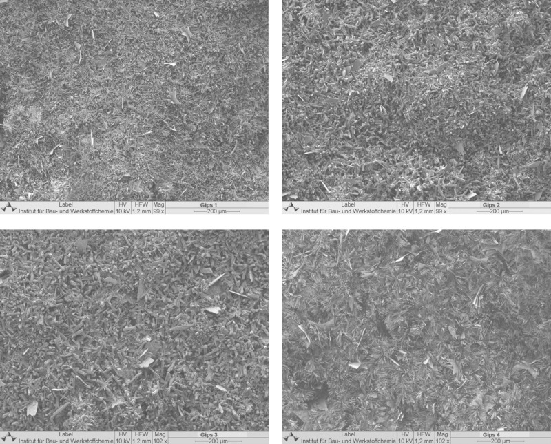 The results of SEM investigation of α-hemihydrate (1) (top right), α-hemihydrate (2) (top left), α-hemihydrate (3) (bottom right) and α-hemihydrate (4) (bottom left) are shown in Figure 13. The α-hemihydrates were seen to form a wide diversity of crystal morphologies with influence on the technical properties and strength formation of the plaster.