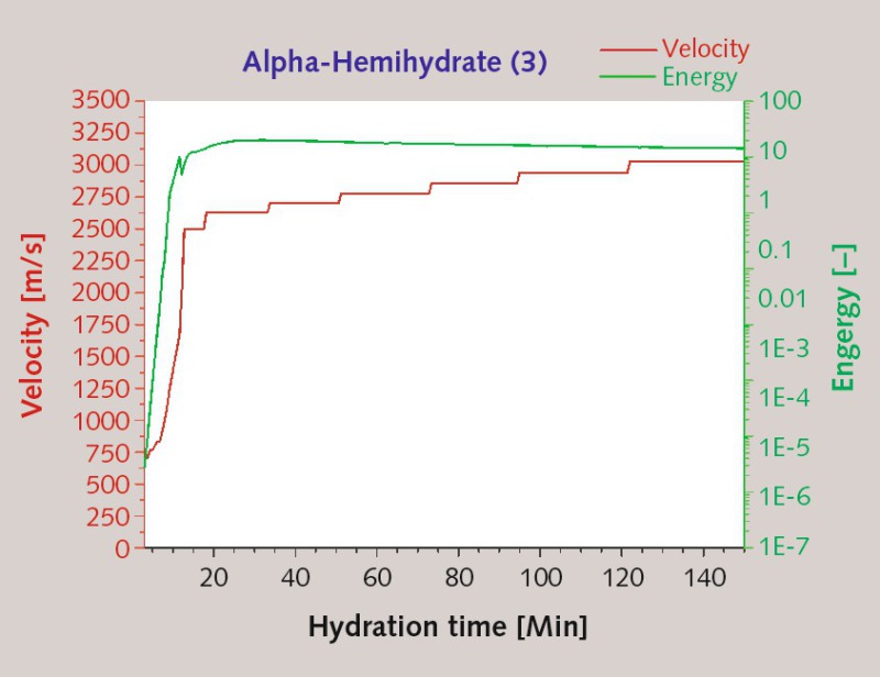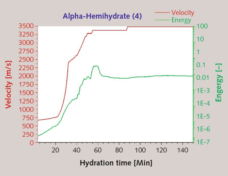 In the results of UT conducted on α-hemihydrate (1), the energy and velocity levels are seen to be rising slowly after 10 minutes and steeply after 20 minutes. The absolute value of relative energy calculated from the squared amplitudes is situated at 0.4, and the maximum acoustic velocity amounts to approximately 3500 m/s. A narrow frequency spectrum of relatively low magnitude extending from 45 to 55 kHz was registered. While the crystal morphology, the formation and dissolution of intermediate phases and the evolution of the micro-and nanostructure proved detectable via changes in ultrasonic energy and in the frequency spectrum, the structural properties and strength evolution can be characterized as functions of ultrasonic wave velocity (Fig. 1 and 2).