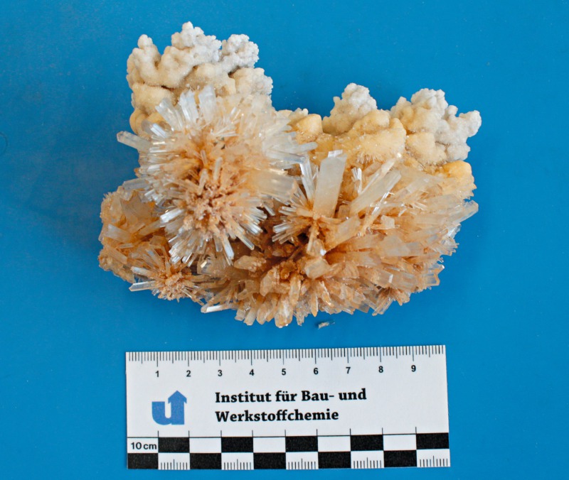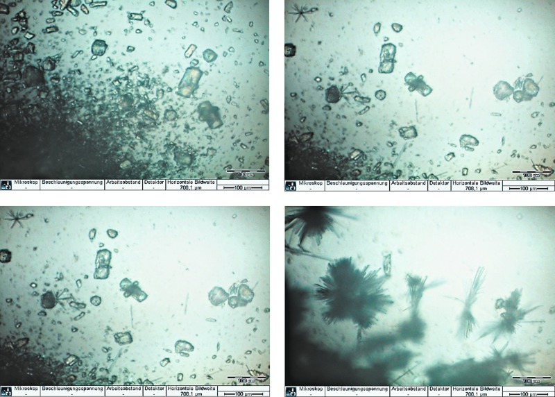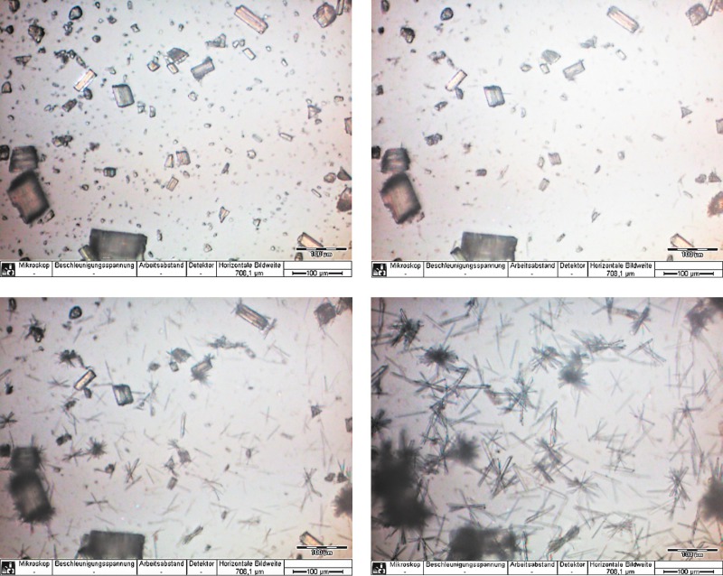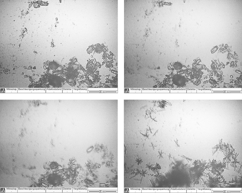 Figure 12 shows the in-situ light-optical micrographs obtained after hydration times of 1 minute (top right), 30 minutes (top left), 60 minutes (bottom right) and 240 minutes (bottom left). The first hydration products were found after 10 minutes of hydration. The α-hemihydrate formed large, branched crystals.