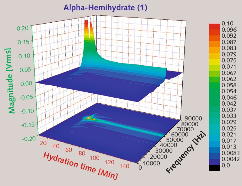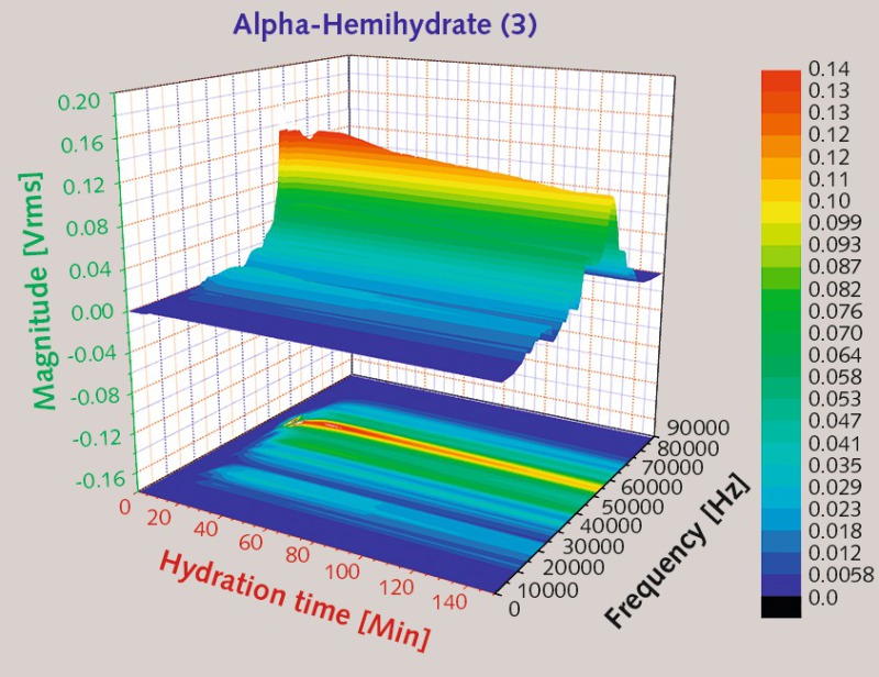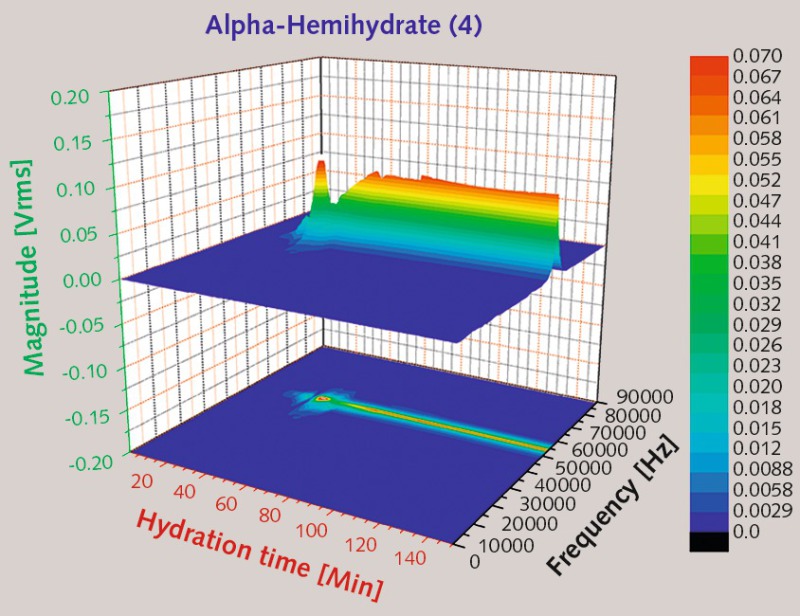 The UT findings for α-hemihydrate (2) show a sharp increase in ultrasonic wave energy after the first two minutes. By contrast, the velocity only began to rise after about four minutes, and to accelerate steeply after ten minutes. The absolute value of the relative energy computed from the square amplitudes came to 20, while the maximum acoustic velocity amounted to approx. 3200 m/s (Fig. 4). A broad spectrum of frequencies ranging from 20 to 70 kHz was registered, and the magnitude was relatively high (Fig. 5).