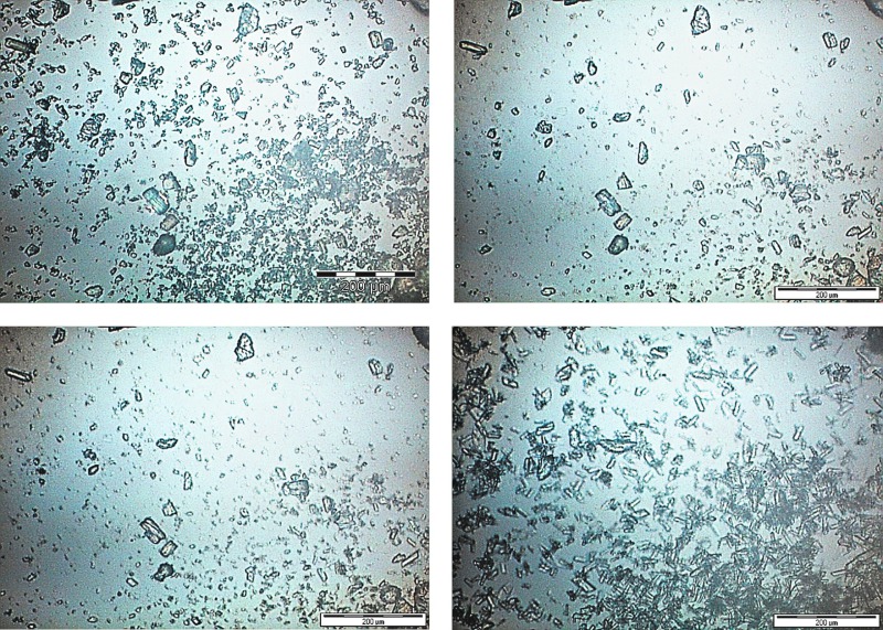 Figure 9 shows the in-situ light-optical micrographs obtained for hydration times of one minute (top left), 30 minutes (top right), 60 minutes (bottom left) and 240 minutes (bottom right). The first hydration products were detected after 10 minutes. The α-hemihydrate was seen to form splintery, somewhat branched crystals that influence formation of the microstructure and strength of the α-hemihydrate.