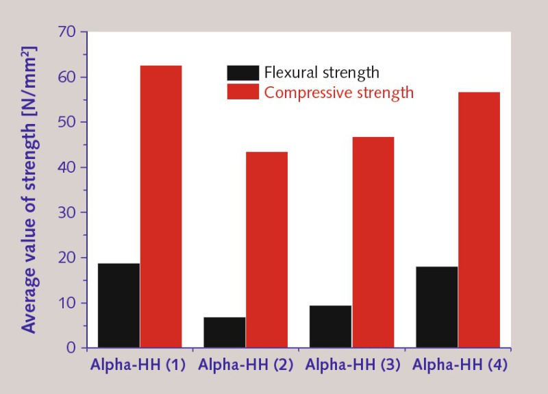 The crystals of α-hemihydrate (3) were somewhat longer than the splinters of α-hemihydrate (2), and its crystals were somewhat larger (Fig. 9 and 13). They were, however, unbranched and therefore more apt to slide against each other. Consequently, their strength values were only marginally higher than those of α-hemihydrate (2) (Fig. 14). Their density was somewhat lower than that of α-hemihydrate (2), because their crystals were somewhat larger. As anticipated, the UT findings (acoustic energy and intensity) for this type of gypsum were somewhat lower than in the case of α-hemihydrate (2), but higher than those of α-hemihydrate (1). The ultrasonic velocity reached its maximum at 3100 m/s (Fig. 7).