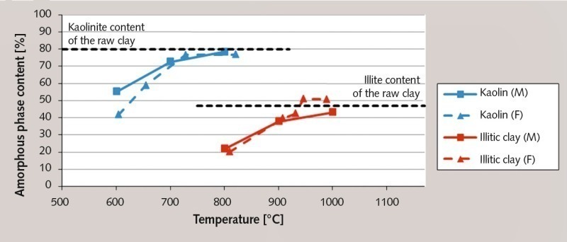 Figure 2 depicts the x-ray diffractograms of the accordingly burnt clays compared to the starting samples. The amorphous and therefore reactive contents are shown in Figure 3 (continuous lines). The diffractograms show that the conversion of the kaolinite in the x-ray amorphous phase takes place analogously to the dehydroxylation of the clay minerals. As this conversion is not yet concluded at 600 °C, a portion of the materials remains crystalline – which can be clearly seen from the kaolinite peak in the diffraction patterns. The partial retention of the kaolinite structure can therefore be attributed to the presence of residual water in the crystal structure. The clay minerals do not become completely amorphized until a temperature of 800°C is reached and all the hydroxide ions have been expelled. The x-ray amorphous product is referred to as metakaolin.