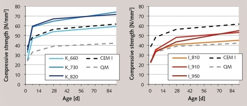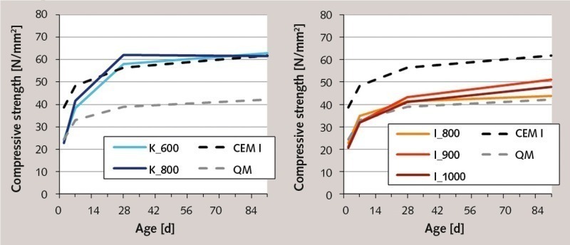 Thus, the values in cements containing metakaolin are significantly higher than the inert quartz meal reference after only seven days, and subsequently even exceed the strength values of pure Portland Cement. The higher amorphous phase content of the 800 °C-metakaolin has only a slight influence in this strength development.