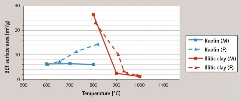 As depicted in Figure 3, the flash calciner process resulted in practically the same degree of activation of the clay minerals as was the case with the muffle kiln process. The extremely short material retention times in the calciner seem to have almost no effect on the activation, which is attributable to the fine dispersal of the clays in the stream of gas. This is also confirmed by the only slightly delayed decline in the BET surface during the burning of the illitic clay (see Fig. 4).