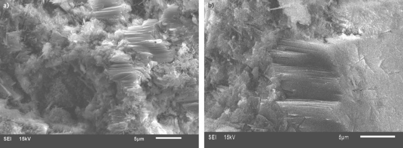 XRD studies of the hydrated samples of OPC, PPC and composite sample COM-2, shown in Figure 3, indicated that the portlandite (CH) content was less in composite samples as compared to OPC and PPC at 28 days of hydration. The factors affecting the CH content in the hydrated samples are the clinker content and pozzolanic activity of fly ash. The broad hump in the XRD patterns of PPC and COM-2 indicated the presence of amorphous content in the samples. The presence of portlandite crystals in 28 day hydrated samples of PPC and COM-2, studied using SEM, is shown in Figure 4. In PPC, portlandite crystals were present as a pack of parallel plate - like structures with preferred orientation.