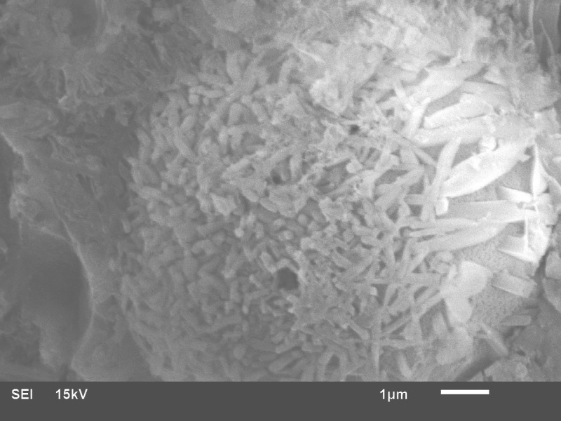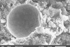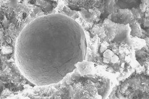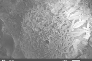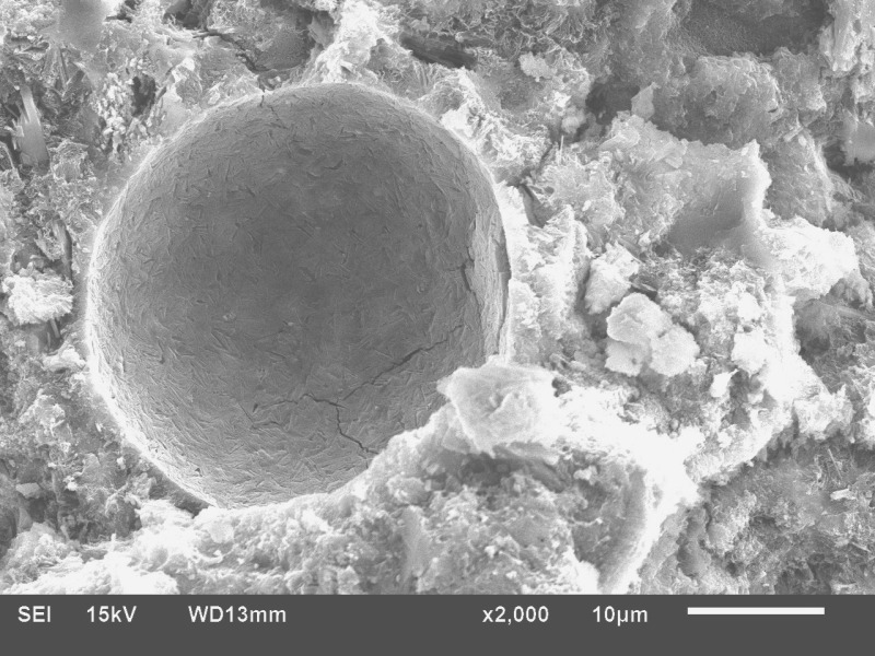 SEM images of fly ash particles at different stages of reaction are shown in Figure 5. Fly ash consists of spherical particles of amorphous nature along with quartz and hematite particles, shown in Figure 5a. Figure 5b shows the partially reacted fly ash, in which the surface of the particle is reacted and needle – like mullite crystals are visible. The completely reacted fly ash particle is shown in Figure 5c, the spherical particle is totally consumed leaving a void space. Dense CSH gel is present around the reacted fly ash particle. The partially or unreacted particles contribute to the filler effect whereas the reacted particles contribute to the formation of additional CSH.