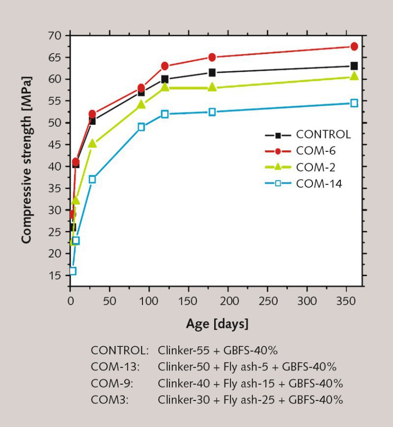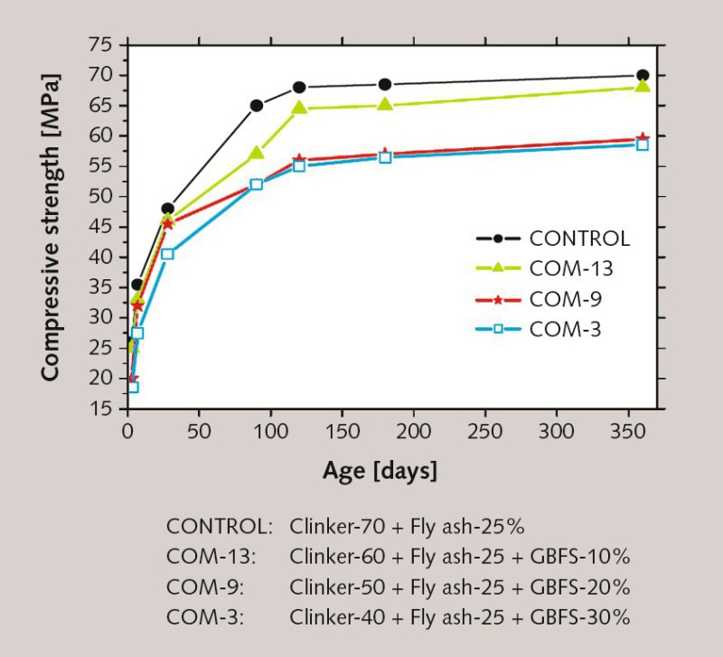 The compressive strength values of composite cement blends was marginally lower at the initial ages and improved at later ages compared to the reference samples. The reduction in compressive strength at initial ages may be attributed to the dilution effect and the improvement in strength at later ages was due to the synergetic effect of the addition of fly ash and GBF slag.