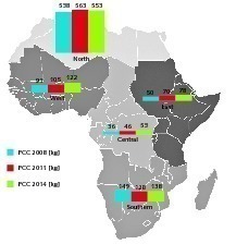 Figure 1 shows the development of the PCC in Africa in 2008, 2011 and 2014. It is interesting to see that in North Africa the PCC stagnates at around 550-560 kg, while in the regions of Sub-Saharan Africa there is significant growth with the exception of Southern Africa, which stagnates at around 140 kg. Largest absolute growth in the PCC was in West Africa, which had an increase in the six years under review from 91 to 122 kg. This corresponds to an increase in the PCC of 31 kg or 34 %. In East Africa the increase to 78 kg corresponds to growth of 28 kg (56 %), while the increase in Central Africa to 47 kg corresponds to growth of 17 kg (47 % increase).