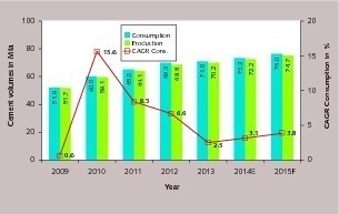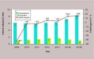 The latest forecasts of the cement growth in the USA by the Portland Cement Association (PCA) suggest that the cement market is expected to have grown by 8.2 % in 2014, followed by 8.4% in 2015 and 10.7 % in 2016 [4]. Nevertheless, in recent years the quarterly PCA forecasts were, mostly, not achieved, but this time the projection could be true. Fig. 15 shows the US cement production and consumption and consumption growth rate by 2015. Different to the forecasts provided by the PCA this projection includes Portland and blended cements as well as Masonry cements. In 2014 cement consumption and production stood at 87.8 Mta and 82.7 Mta respectively. The consumption is expected to grow from 7.5 % in 2014 to 9.0 % in 2015, leading to 95.7 Mta.