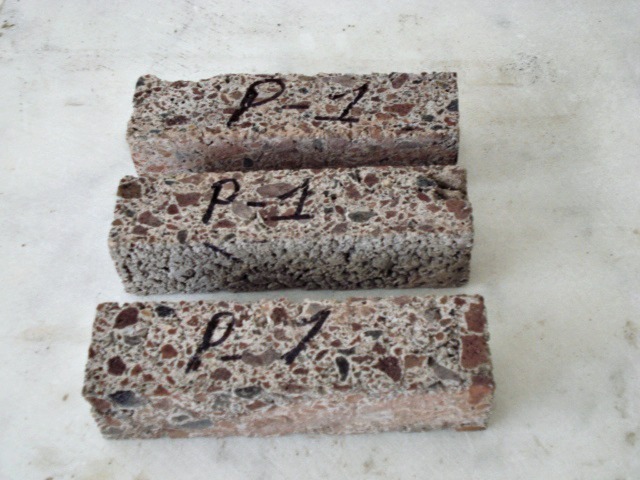 Phase 3: Test specimens of series III (PIII) (Table 6) were prepared with the same mortar as PI, but once the mortar left the mixer, EPSt (73.70 % of the total volume of the mixture) water (0.50 l) was added to a total of 126 l of mortar. The final mixture was used to fill the seven samples (lapilli mortar 25.93 %, EPSt 73.70 % and water 0.37 %). The quantity of EPSt added in these specimens, exactly doubles the amount added in Series II specimens.