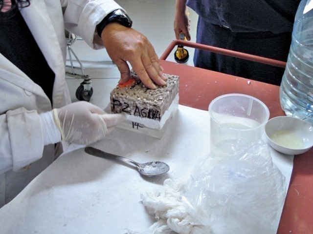 Three specimens of 160 mm x 40 mm x 40 mm were cut from the sample panels (60 cm x 60 cm x 5 cm). The flexural strength was determined following the UNE-EN 1015-11: 2001 standard, i.e. applying a load at three points (using rollers) until failure. The contact points of the rollers and the sides of the specimens were cleaned with a cloth in order to remove particles or other materials. The smoothest side of the specimen –the one in contact with the mold – was placed on the rollers. The load was applied at a uniform rate between 10 N/s and 50 N/s, so that failure occurred between 30 s and 90 s.