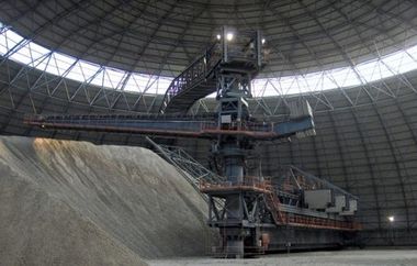 One common way to store large volume bulk materials is by stacking them in long, prismatic piles. The material is loaded with a side stacker, or with a tripper car from above. Reclaiming is done with a bridge or side scrapper reclaimer or with front end loaders. There is no better example than the domes of Carthage Cement in Tunisia.