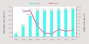 In Germany the thermal substitution rate (TSR) increased from 7.4 % in 1990 to 61.0 % in 2010 and 64.6 % in 2015 (Figure 4). Until 2005 there have been high 2-digit growth rates in the use of alternative fuels. After 2010 the use of alternative fuels plateaued at around 60 %, partly due to economics, partly due to availability and supply of alternative fuels and partly due to technical issues and other reasons. But the increase in the use of alternative fuels is limited and not without problems. In Germany permits for the burning of alternative fuels has not been a big problem. This is different, for example, to Italy, where in 2015 Italcementi operated a total of seven cement plants, but only two had a permit to use alternative fuels. About 0.5 Mta of AF has been exported to cement plants in the EU [3].