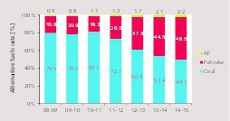 Some countries and some companies achieved a very significant increase in the use of AF in just a few years. In Poland for example the AF rate grew in a record time from less than 20 % in 2007 to more than 50 % in 2015. Since 2013 there has been a landfill ban on separately collected combustible waste and in 2012 the waste-to-energy capacity had a share of less than 0.2 % of the combustible waste. Naturally, the cement industry profited from the situation. Cemex in Latvia is another example. In 2010 they commissioned a new 3500 t/d line. An early decision was made, when the new plant was planned, to use alternative fuels [4]. The results show that AF rates from 0 to 80 % can be achieved in a few years (Figure 12), but this needs the availability of alternative fuels, the acceptance by all the stakeholders and importantly the specific application know-how.