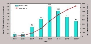 The potential for retrofitting WHR systems in existing clinker production lines is declining. The China Cement Association (CCA) presumes that less than 25 % of the existent modern kiln lines can be retrofitted with WHR systems.