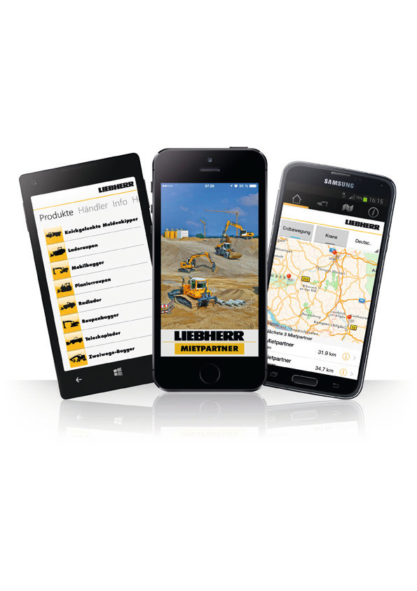 Since February 2015, Liebherr from Biberach/Germany is offering its customers in Germany, Austria and Switzerland as well as France and Great Britain the opportunity to hire construction machines using a smartphone and tablet app. The app provides a quick overview of the equipment available in the Liebherr hire park and of the Liebherr dealer network. The app can be used in English, German and French.