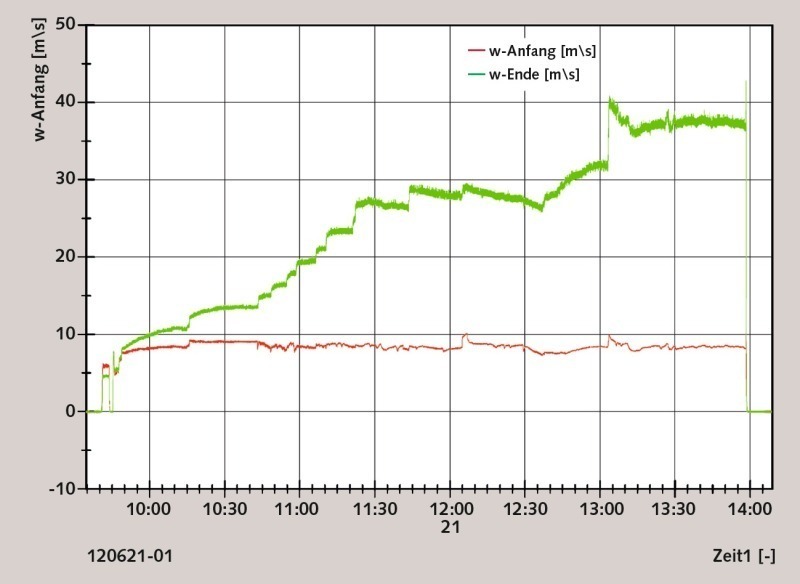 The material feeding was slowly increased to a throughput of approx. 1.1 tph. The pressure drop between the infeeding point and the receiving silo is clearly shown in Fig. 14, as is the pressure increase during the start-up phase. After approximately one hour the stable conveying phase is reached. The variations in the pressure curves are caused by the pressure vessel change-over. During the stable conveying phase the curves run approximately parallel. Pressure fluctuations travel through the conveying pipe with a slight time offset. The average material velocity in the conveying pipe is approx. 1.4 m/s, which indicates that dune conveying is taking place.