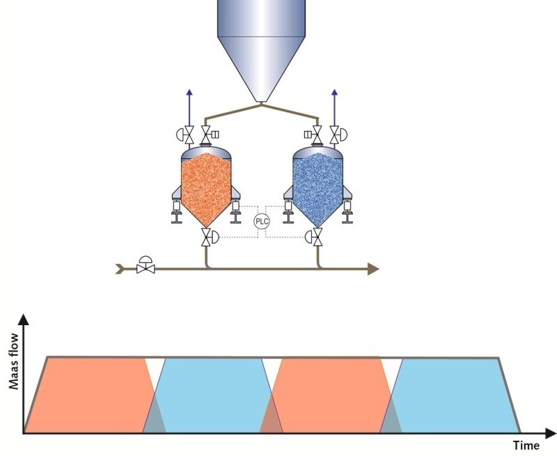 To ensure that the material is dosed into the conveying pipe at a constant and monitored rate, the two pressure vessels are mounted on load cells. The feed rate can be regulated by means of flow-regulating valves at the outlets of the pressure vessels as well as by variation of the top pressures in the pressure vessels. To guarantee the minimum velocity at the point of material infeeding into the conveying pipe, the conveying gas velocity is determined before feeding and kept constant throughout the starting-up, operation and running-down processes. This procedure ensures that material transportation is carried out independently of the material feed rate – i.e. also independently of the variable back pressure from the conveying process.