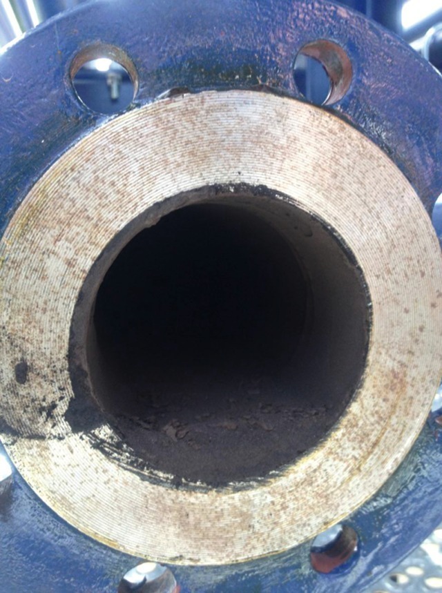 This naturally provokes the question as to whether such a system could be restarted to proper operation after an emergency shutdown or a power failure has taken place. However, in the presence of the client a restart was successfully tested as part of the system trials. Furthermore, after a stoppage the conveying pipe was taken apart at several places and the depth of the material bed was measured. As shown in Fig. 15, there was only a thin layer of material at the bottom of the pipe.