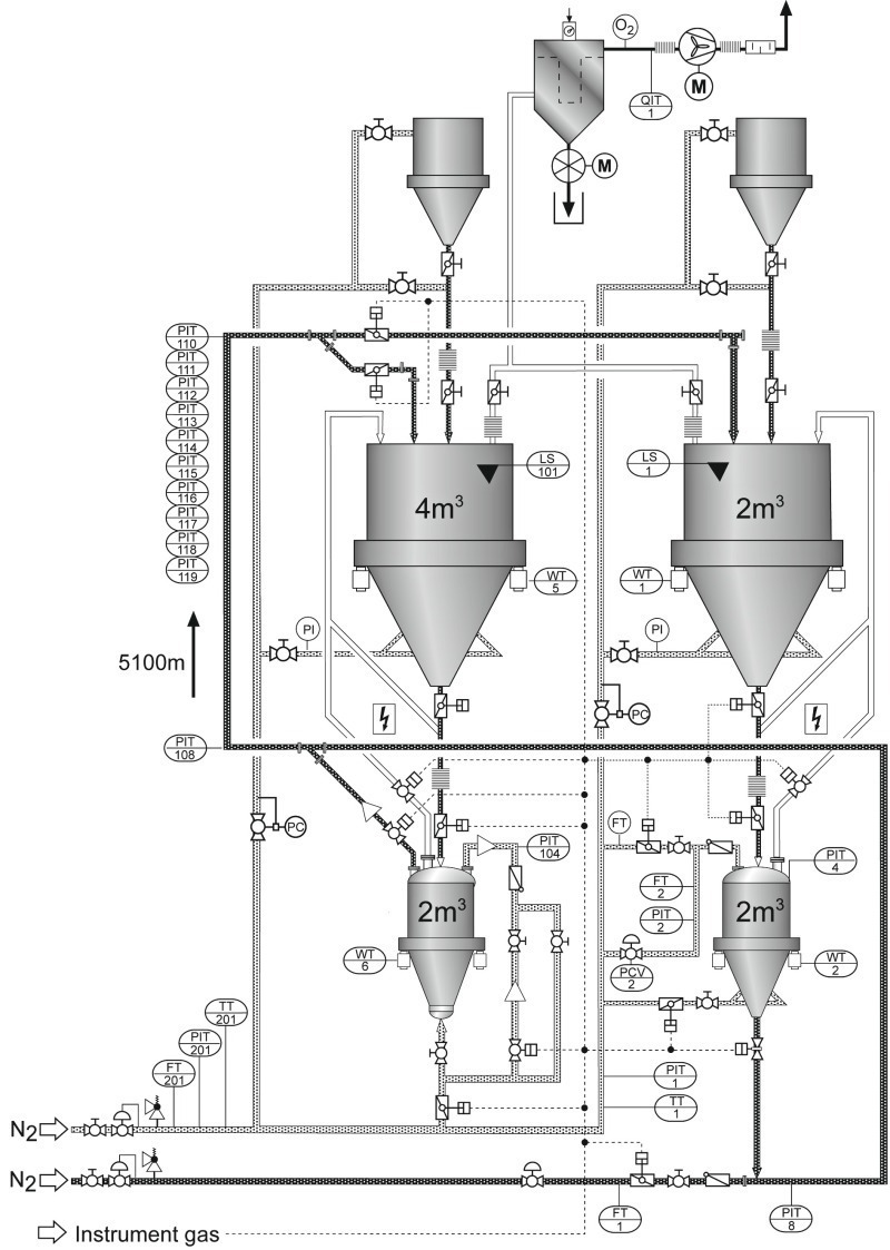 Subsequent to the general designing of the conveying system and its components, such as pressure vessel volume, type and inside diameter of the piping, the expected pressure drops and the conveying gas requirement, planning of the measurement and control equipment took place under consideration of all safety-rel-evant aspects (Figs. 3 and 4). As this project involved the conveyance of coal dust, the entire conveying system including the dedusting equipment was rendered inert by means of external nitrogen evaporators. The monitoring takes place online.