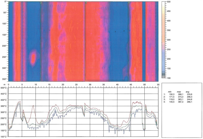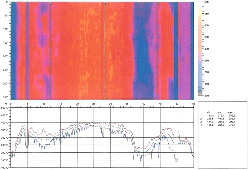 After the first commissioning in April 2012, the described large-area kiln shell cooling system resulted in entirely satisfactory measurement. Within a very short time, temperatures fell by an average of 50 °C over the entire area (Fig. 5). As a result, the coating in the rotary kiln has become significantly more stable, which is especially obvious when disturbances arise due to the operating conditions or when failures occur in the secondary fuel supply.