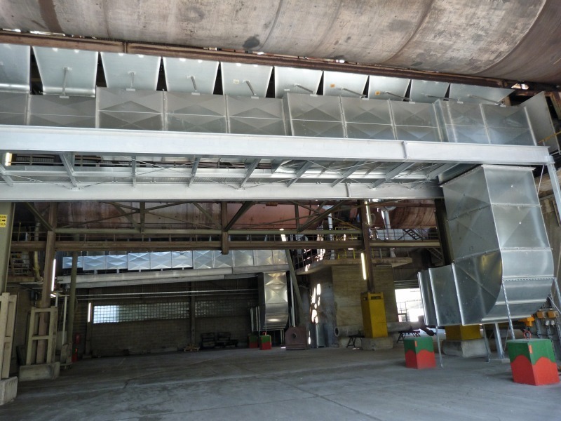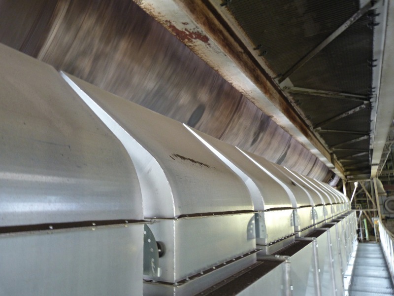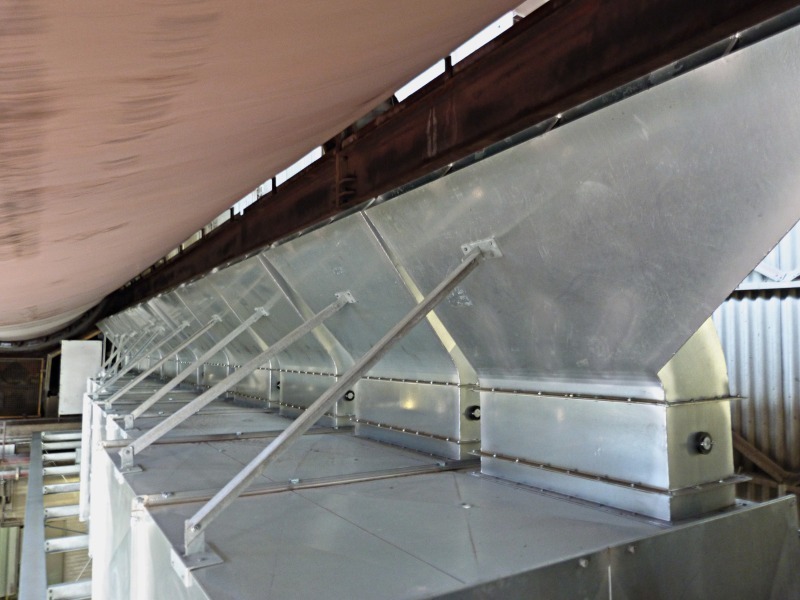 In order to achieve a significant cooling effect, a 17 metre long collecting duct fitted with cooling nozzles was installed along each kiln axis (Fig. 1). The distance between the nozzles and the surface of the kiln shell is approx. 300 mm, which enables a very good cooling effect to be achieved. The short distance between the individual cooling nozzles (approx. 50 mm) guarantees a uniform supply of air over the entire cooling zone (Fig. 2). The fluidic design of the duct system assures uniform exit velocity at the cooling air nozzles. To hold the duct system, a special supporting structure with walkway was installed (Fig. 3).