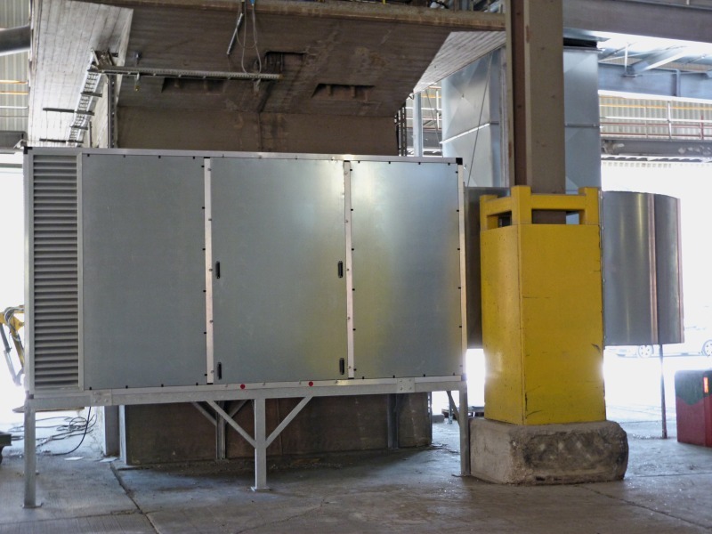 The air is supplied by two axial fans with an impeller diameter of 1600 mm and a drive power of 45 kW. With each of these axial fans, 130 000 m3 of air per hour is uniformly distributed over the surface of the kiln shell. To reduce their noise emission, the axial fans are equipped with an intake air silencer and an exhaust air silencer, and are assembled as a compact unit (Fig. 4). By means of butterfly dampers installed in the individual nozzles, the supplied air can be throttled to the desired velocity (max. 20 m/s), and specifically delivered to the area of the kiln shell that requires cooling. In this manner, the cooling system can be adapted to changing requirements.
