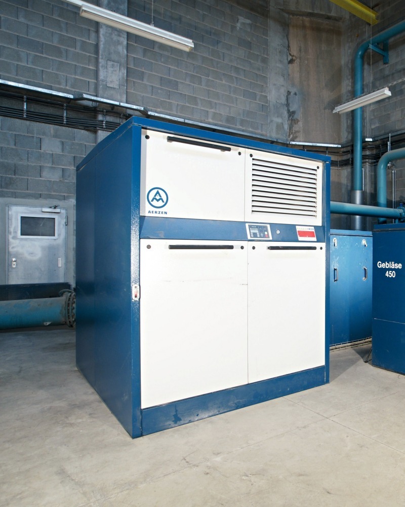 The compressed air required for the raw meal transport and for another homogenization is provided by four big oil-free compressing air-cooled Aerzen screw compressors type VM 537 (quantity delivered 96 m3/min each; pressure range 2.6 to 3.3 bar depending on demand). One of these compressors supplies the compressed air for the transport, two packed units produce the compressed air for the uniform mixing of the materials (homogenization) and a fourth compressor is held available as redundancy. Since commissioning these four plants have operated 114 900 hours, 117 800, 34 500 resp. 38 400 hours (as of June 2010).