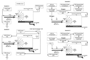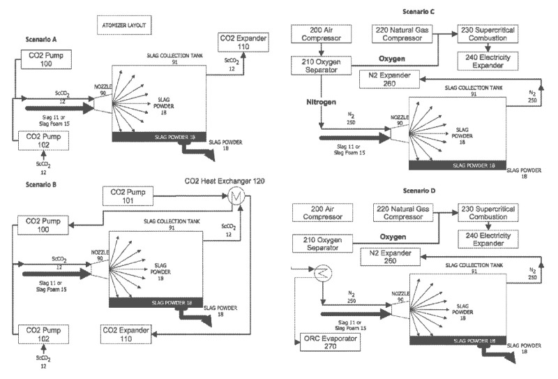 (57) A slag powder and cement production system capable of utilizing slag immediately after generation as a byproduct of a primary manufacturing process to recover thermal energy of slag concurrently with preparation of slag for cement in a powdered form to maximize energy recovery from primary manufacturing process and to minimize energy consumption to transform slag into a slag powder. Preferably the heat removed from the liquid slag as it solidifies is recovered for useful work, such as sustaining the primary manufacturing process or co-located cement production process and/or electric power production preferably through a supercritical CO2 thermodynamic cycle operating through a heat exchanger less transfer of thermal energy from the slag.