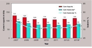 The amount of exported cement transported by ship (incl. the Canadian Great Lakes) in the overall cement export volume is shown in Fig. 3. In 2007, the quantity transported by ship was 97 Mta or 74 %. In subsequent years, this amount declined, mainly as a consequence of the collapse in markets in the USA, Spain and Nigeria, to 70-71 % [3]. Since 2012, a slight increase in maritime transport has been apparent. The market is particularly characterized by surplus cement capacities in the exporting countries, demand for cement and relatively high cement prices in the importing countries, and by the freight charges for maritime transport. There can be large differences between neighbouring countries, such as those currently existing between the United Arab Emirates (UAE) and Saudi Arabia. While cement demand is stagnating in the UAE, where there is also a high surplus capacity, so that prices are in the order of 54.5 US$/t (1st quarter of 2013), Saudi Arabia‘s cement demand rose by 10.7 % in the 1st quarter of 2013 compared to the preceding year, and current cement prices are around 68 US$/t.