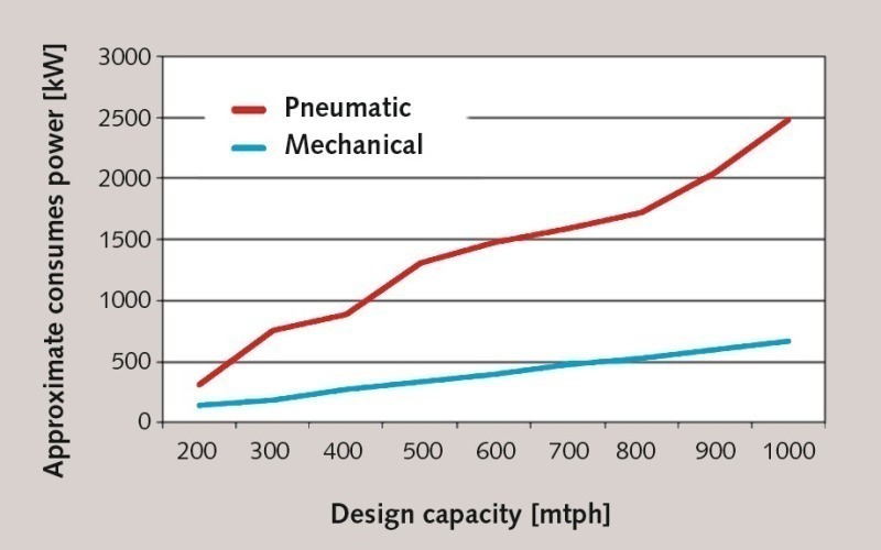 Conveyance from the ship unloader to the storage silos can also be undertaken by mechanical or pneumatic systems. These involve defined material transfer points, as the ship unloader normally travels along the ship from cargo hatch to cargo hatch. For the transfer points, at which the material is fed to the actual conveyor units, pneumatic troughs have proven particularly effective. The nature of the subsequent conveying equipment mainly depends on the conveying distance, the delivery height and the required throughput. For longer conveying distances of up to 500 m and throughput rates of 400 t/h, screw pumps are generally used. For higher throughput rates the system can be equipped with several parallel screw pumps. Bucket elevators are employed for vertical conveyance, while high-capacity belt conveyors can be used for mainly straight conveying routes.