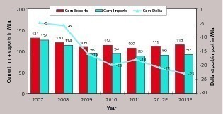 Fig. 2 depicts the cement import and export figures as well as the differences between importation and exportation. That there are differences between the import and export figures is due to the fact that the countries and other bodies publishing data mostly state precise export figures but uncompleted import figures [2]. Cement imports are undertaken not only by cement companies but also by independent importers or companies of the concrete industry for their own requirements. This causes corresponding gaps in the statistical recording. The cement export figures therefore provide more exact information about the actual trade in cement. The graph shows that exports fell from 131 Mta in 2007 to 109 Mta in 2009 (-17 %). Since that time, exports have shown a slight upward trend with figures varying between 107 and 115 Mta. The difference between exports and imports have become bigger and bigger: starting with an original difference of 5 Mta, it has now reached 23 Mta, i.e. in 2013 an imported quantity of approx. 20 % remains unaccounted for.