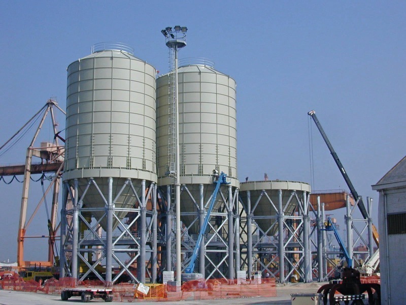 In recent years, steel silos or batteries of steel silos have been specified in numerous projects with handling capacities of up to 1 000 000 t (Fig. 11). Such silos are relatively simple to erect, and the individual silos can have diameters of 8-12 m and capacities of up to 4000 -5000 t. To assure trouble-free discharge of the cement, the silo bottom is usually cone-shaped and is equipped with an aerated floor. Steel silos also permit a relatively high degree of flexibility with regard to storage of different cement types. Moreover, if the silos are mounted on a substructure, loading lanes can be installed beneath them. Such advantages cannot easily be implemented with dome silos or flat storage halls. Separation of the silo interior into different compartments is pos-sible but not easy to realize. For dispatch purposes, a separate building with suitable intermediate conveyors and dispatch silo feeding system is almost always necessary.