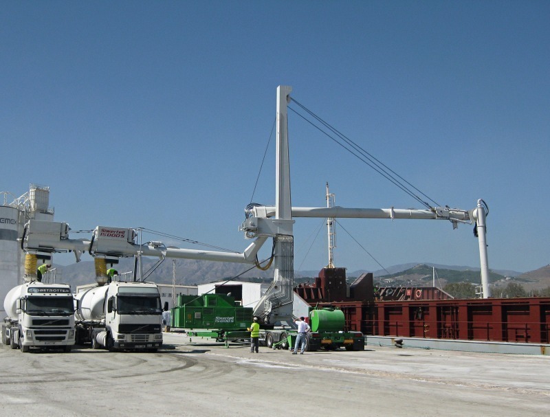 Mechanical (continuous) ship unloaders are supplied in a very wide range of sizes. They can therefore be employed for all sizes of terminal and ship and have unloading capacities ranging between 400 and 1500 t/h. Depending on the size of ship, road-mobile mechanical ship unloaders are available for 5000 to 15 000 dwt (Fig. 9), while larger, so-called high-performance ship unloaders (Fig. 10) handle ship sizes of 40 000 dwt and more. The mechanical systems employed for cement are always equipped with screw feeders and screw conveyors that have an energy consumption of 0.5 kWh/t. The technological configuration of all sizes of mechanical ship unloaders is more or less identical. Modern high-performance ship unloaders are usually of modular design, having a lightweight steel structure. To assure a constant material unloading rate, the systems are equipped with speed-controlled extraction screw conveyors [6]. There are also numerous innovations in the technical details.