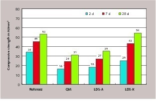 The results of the compression strength test are shown in Figure 4. It becomes clear that the new type of material derived from the Loesche process exhibits a high hydraulic potential. Already after two days, the slag itself supplies a considerable contribution to the strength development, thus indicating that this particular mixture exceeds the strength level of the comparison sample made of silica sand, so far. After seven days, the respective mixture nearly reached the strength level of the reference cement; in fact, 28 days later, the sample exceeded this level slightly.