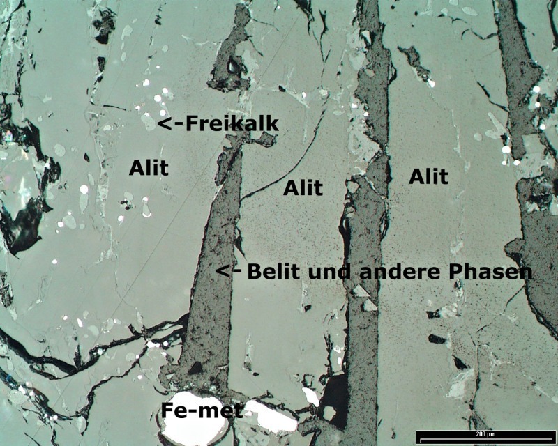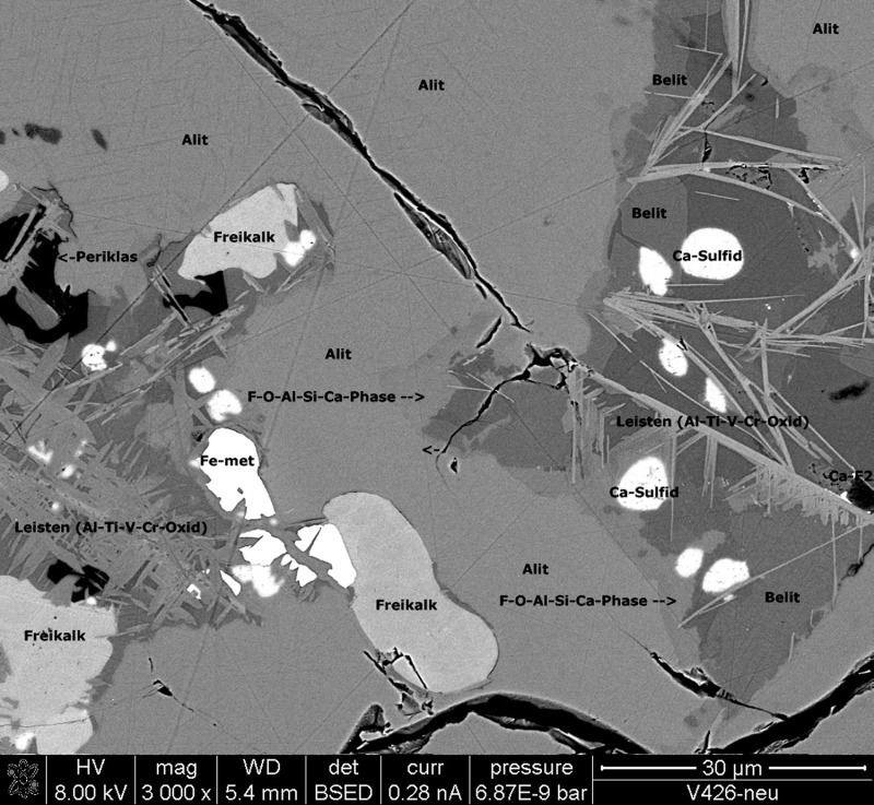 Comparing the initial slag aggregate, after clinkering the slag (so called “Klinkerweg”) a number of the present phases had changed significantly. Now, an alite content of approx. 66 % could be found. In order to ensure the results, they were reproducible and the tests were repeated several times. The results were consistent, producing similar alite contents in each case. Using a scanning electron microscope, the tests showed very compact areas of alites that were measurable within a range of several millimetres (Fig. 2).