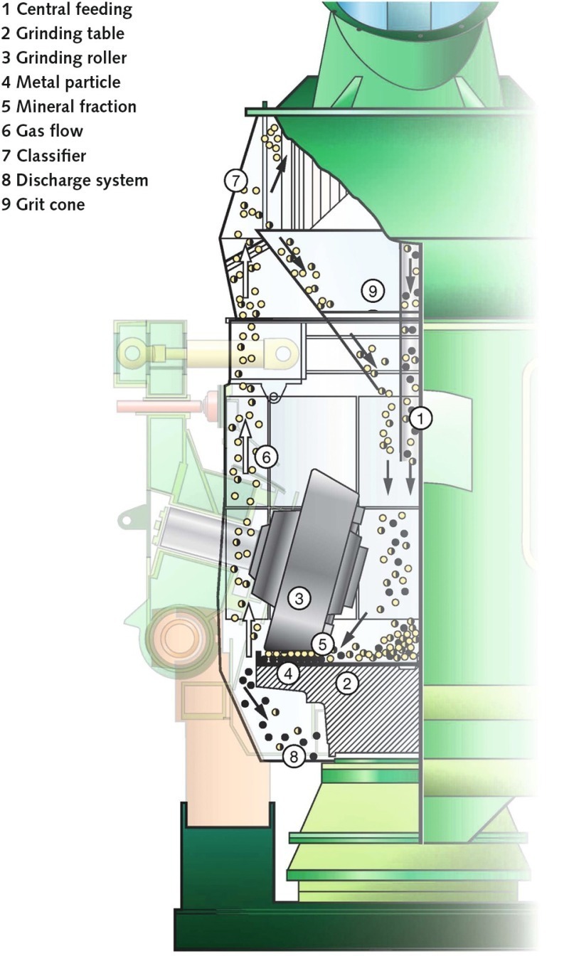 Particles of the mineral fraction to which some metal still adheres or which have not been ground to the required product fineness, will be rejected by the classifier rotor and, fall back due to gravity onto the grinding table for re-grinding.