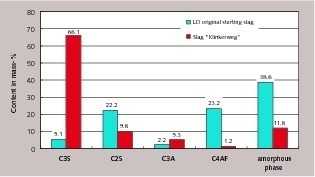 The untreated initial slag already showed a significant amount of belite (C2S) in excess of 20 %; and a glass content of 38.6 %. However, a corresponding reactivity was not present. The alite content of the initial sample was merely 5 M.-% (Fig. 1).