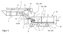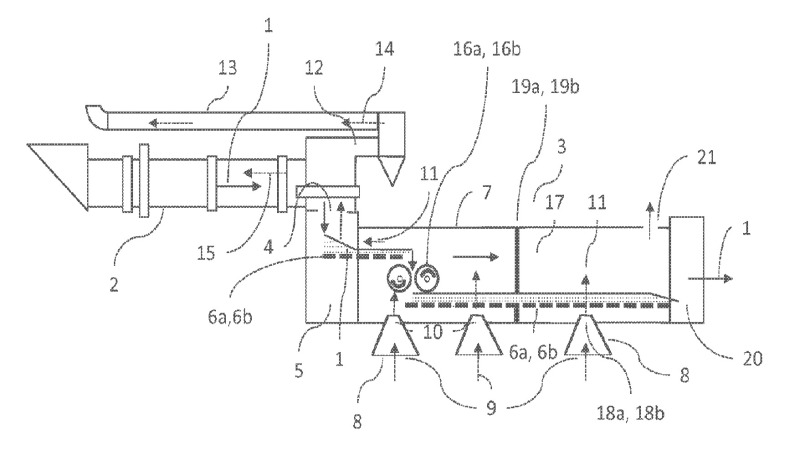 (57) A method and device for cooling and comminuting hot cement clinker in a cooler. The cooler has an inlet region for receiving the hot clinker, a recuperation region, a final cooling region having a clinker cooling device, an opening for blowing cooling air into the recuperation region, a tertiary air line for conducting away heated cooling air, an outlet region for discharging cooled clinker, and at least one conveyor to transport the clinker through the cooler. The hot clinker is tipped into the cooler through an input opening into the inlet region. The...
