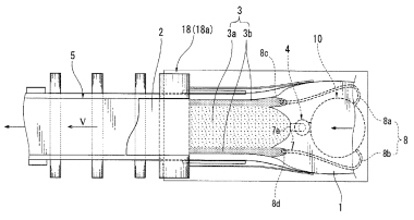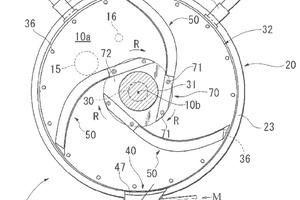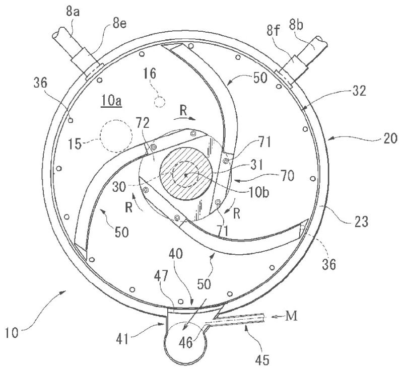 (57) The present invention makes it possible for gypsum slurry to be uniformly and sufficiently kneaded in a kneading area of a scraper type mixer. This mixer has a circular housing (20) forming a kneading area (10a) in which gypsum slurry is to be kneaded, a rotating disc (32) arranged inside the housing and rotating in a prescribed rotating direction, a rotating drive shaft (30) integrally connected to the rotating disc, a plurality of scrapers (50) arranged in the kneading area, and a slurry discharging port (40) disposed in a circular ring wall (23) of the...
