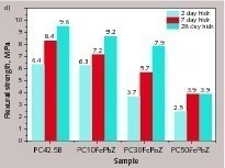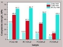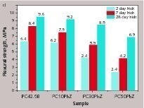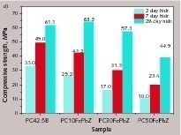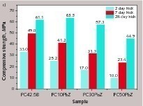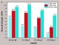 Therefore, the optimal mass content of zeolite or previously mentioned contaminated zeolites in Portland cement should not exceed 30 %. Having this in mind, three cements with 30 % zeolite addition show high flexural strengths after 28 days of solidification: PC30Z - 9.7 MPa; PC30FeZ - 8.4 MPa; and PC30PbZ – 8.5 MPa. Cement PC30FePbZ shows the 7.9 MPa value for flexural strength, which points out that it is possible that minimal content of this contaminated zeolite is used in the Portland cement.