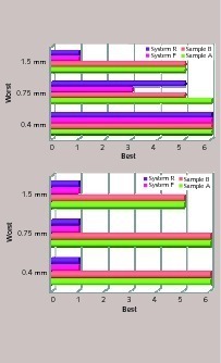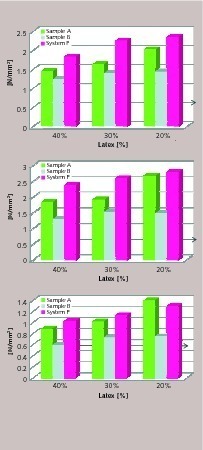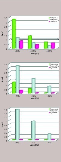 As shown in Figure 6 and Figure 7, the EN-14891 crack bridging and adhesion standard can be reached at lower latex dosage compared to commercially available systems. When the membrane is used in basements or as concrete protection, the required standard is EN-1504-2 in which flexibility is measured following static crack bridging. This test, in particular at low temperatures, is very difficult to pass when the membrane is prepared using a fast drymix. Figure 7 presents the static crack bridging results of sample A and B in comparison to system R and F using commercially available binders. It could be shown that the technology helps to achieve significantly improved results.